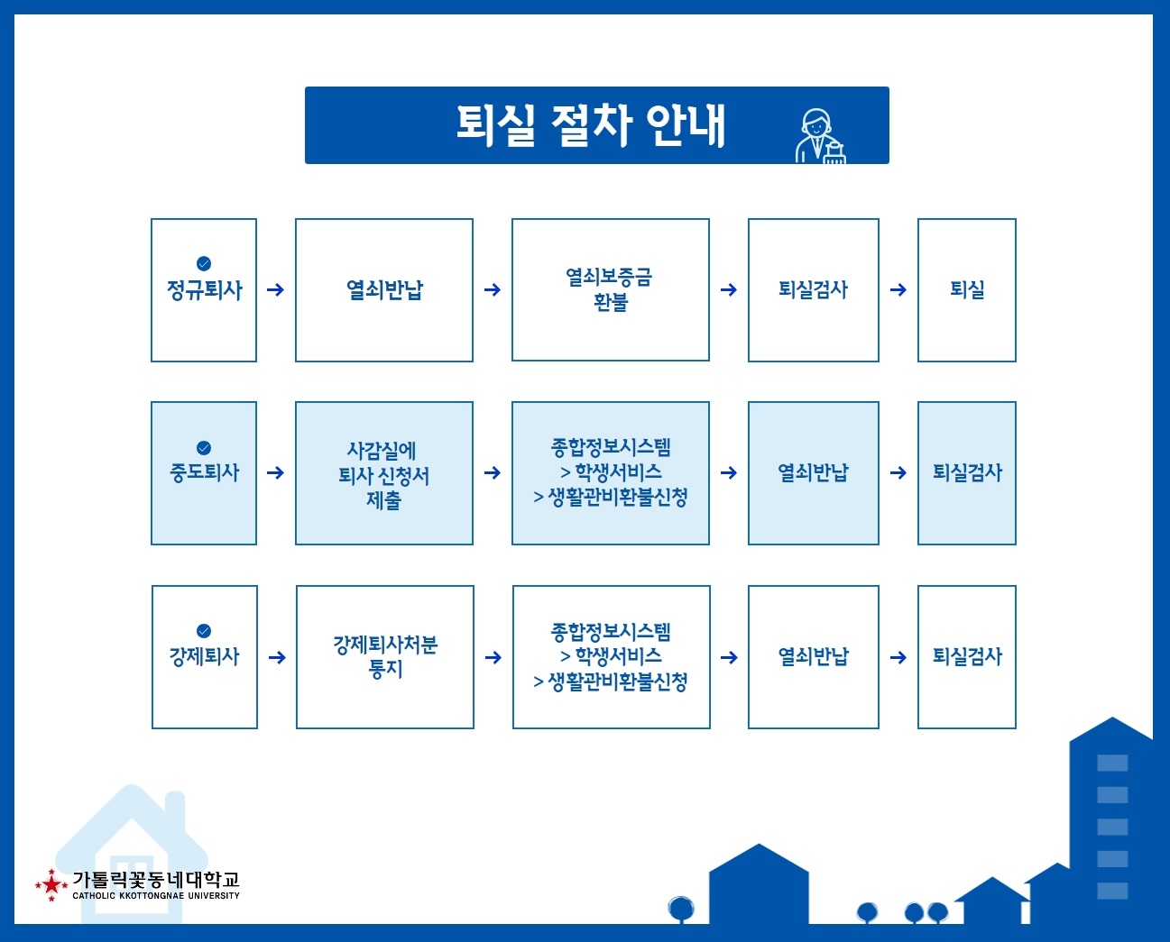 • 재학생 입사신청 : 종합정보시스템 → 학부학사 → 학생 → 생활관관리 → 생활관신청.